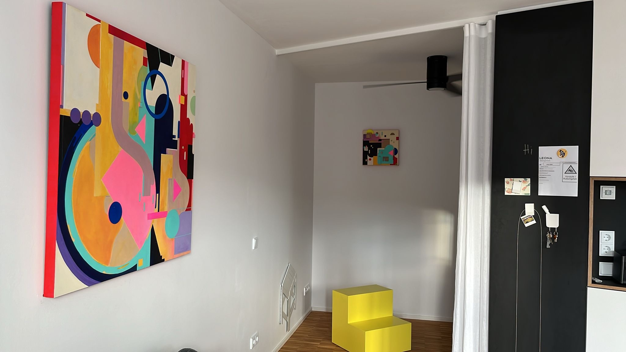 Artworks commissioned for a renovated micro-apartment in Berlin. The renovation was carried out by architect Paola Bagna. The client wanted to concentrate the chromatism in a work of art located in the living room, in a space of 38m2 in which every corner finds its functionality and every centimetre is exploited. The materials and finishes of the flat create a clean, clear atmosphere in which, despite its small space, one breathes harmony and peace. With basic geometric shapes and a reduced colour palette, the artwork echoes the materials and shapes used in the renovation, creating a perfect harmony between environment and image.